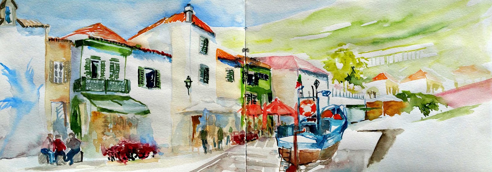 I was a bit early and sat down directly on the mole in front of the ships and my sight was inland. It was still a bit chilly. I unpacked my tiny watercolour box and began to paint in direct watercolour from the left to the right side in order not to smudge the colour on my watercolour sketchbook. To the left of my drawing there was the little church, then the houses with shops and cafés and then I focused on the blue fishermens boat.