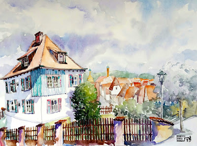 Jana was sitting behind us and painted a scenic sketch of houses and a few of us in front of her into her sketchbook. See here on FB